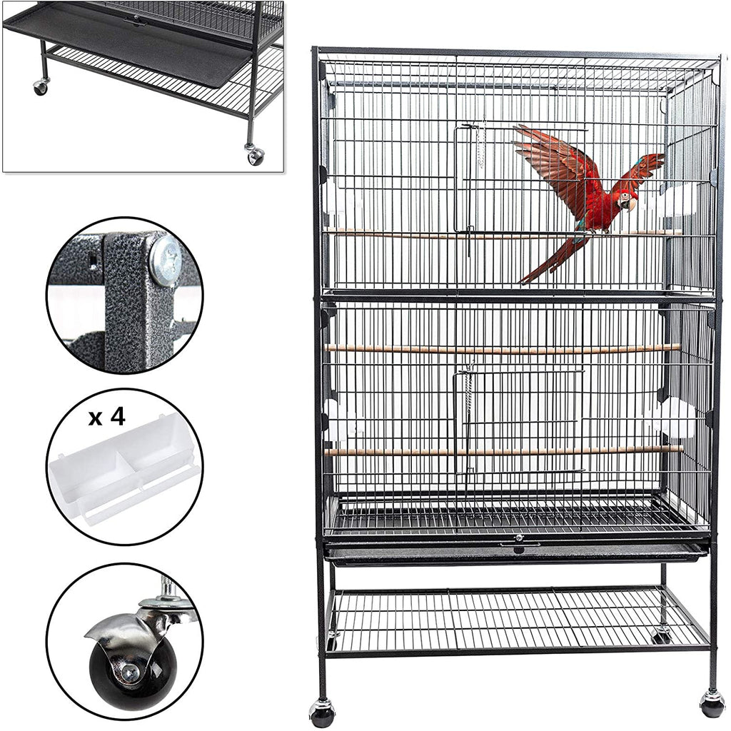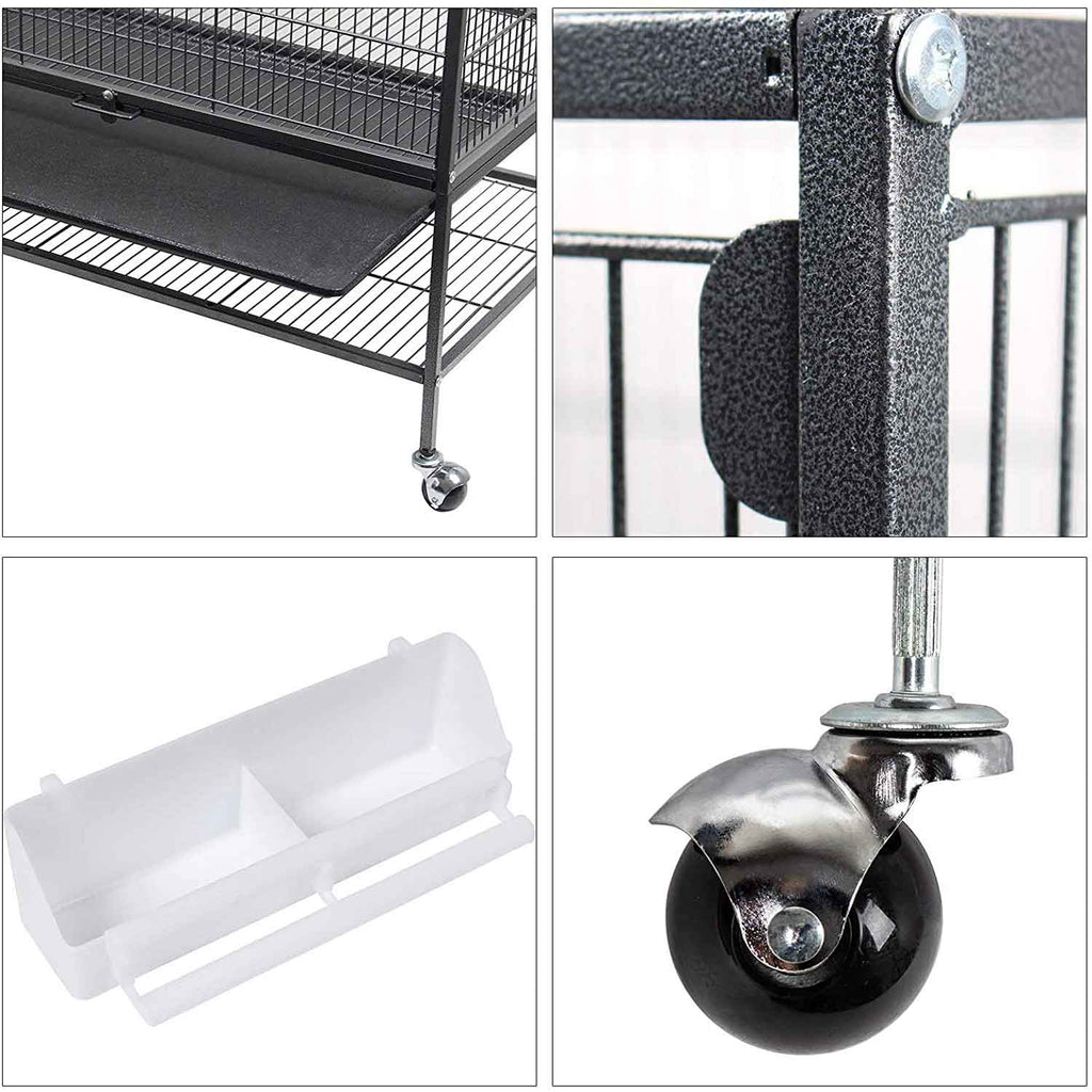 Heavy duty bird cage is constructed of powder coated hammertone paint metal which guarantees great performance in rust, water and corrosion resistance. It is a sturdy parrot cage that is prepared for long-term use. Considerate design makes cleaning a breeze. Simple structure and illustrated instruction allow this cage to be assembled without any difficulty.