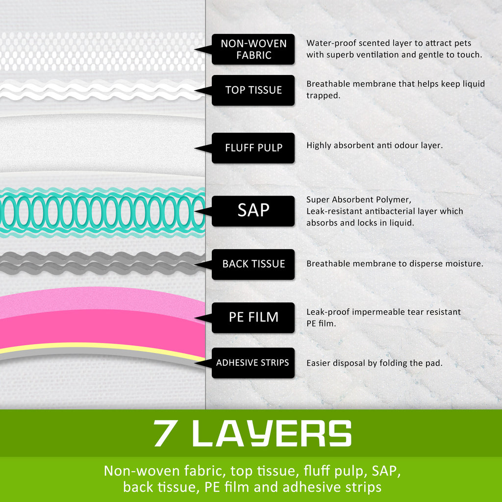 The pad is made of high-quality soft non-woven fabric with 7 layers of protection so it absorbs high quantity of liquid. We tested and it can hold up to 850ml of liquid without leaking. The pad is treated with antibacterial protection so you can have a peace of mind that your beloved pet is protected. Together with the super absorbent pad, the high-quality leak-proof and tear resistant plastic liner and borders ensure that no liquid is leaked outside of the pad. This is very important as you do not want to do extra cleaning as well as your dog to be confused as to where it should do their toilet necessities.