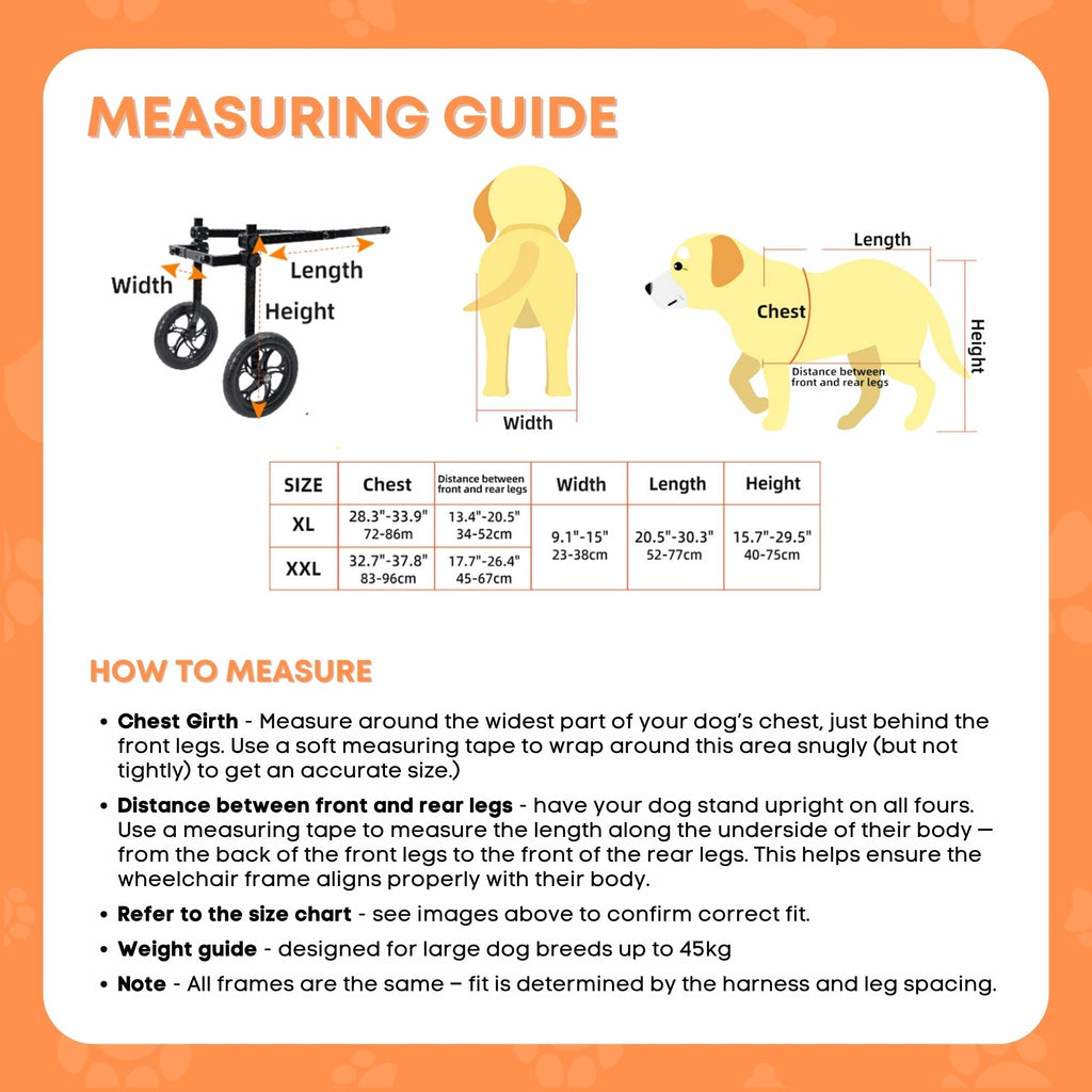 Sizing Note: This wheelchair is specifically designed for large dog breeds up to 45kg. The wheelchair frame remains the same size across all options — what changes is the harness size, which must match your dog’s body measurements.