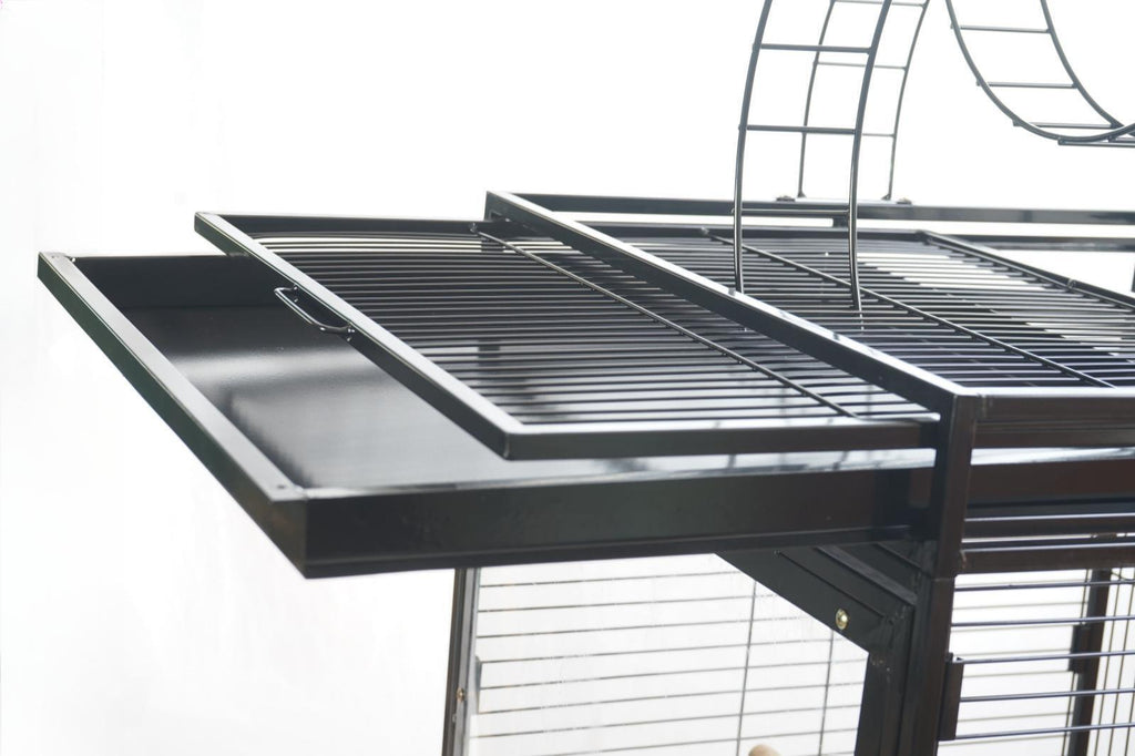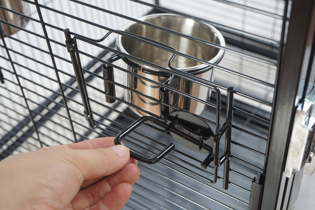 Taking care of bird is made easy with one large access door and two side doors to reach inside the five food and water bowls and take them out for refilling or cleaning. Cleaning is hassle-free with the slide-out top and bottom tray that can also be removed.