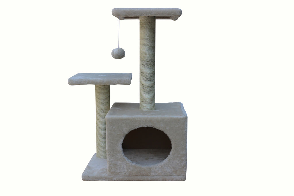 There is a resting box at the bottom of the tree to provide some shelter. The tubes are wrapped with sisal ropes for your pets to scratch and play with. The sturdy base prevents any swaying so it is safe on any flat surface so you do not have to worry about injury to your cat. The stylish cat tree will blend in with your decor.